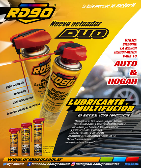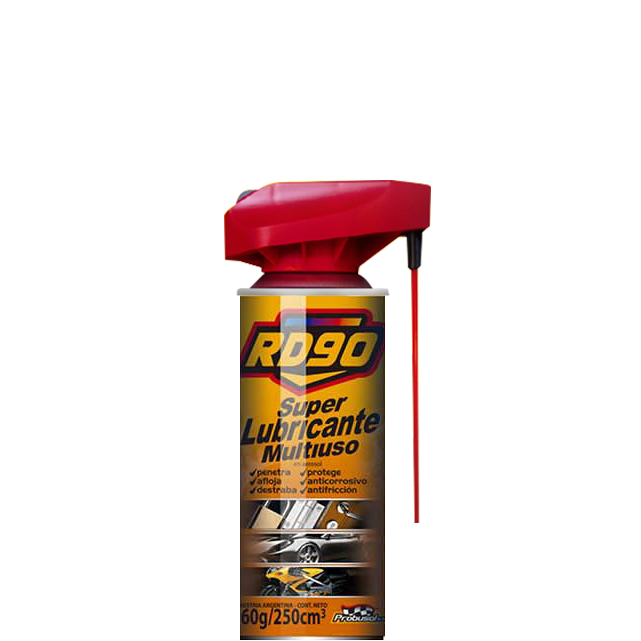 RD90 SUPER LUBRICANTE MULTIUSO CON ACTUADOR DÚO. Ultra rendimiento. Para aplicar en todo aquello que gire, friccione, roce, deslice o cruja y sobre mecanismos trabados por el óxido y la humedad. Ideal para recubrir y proteger grandes superficies. Remueve manchas y pegamento de calcomanías sobre cristales, parabrisas, etc.