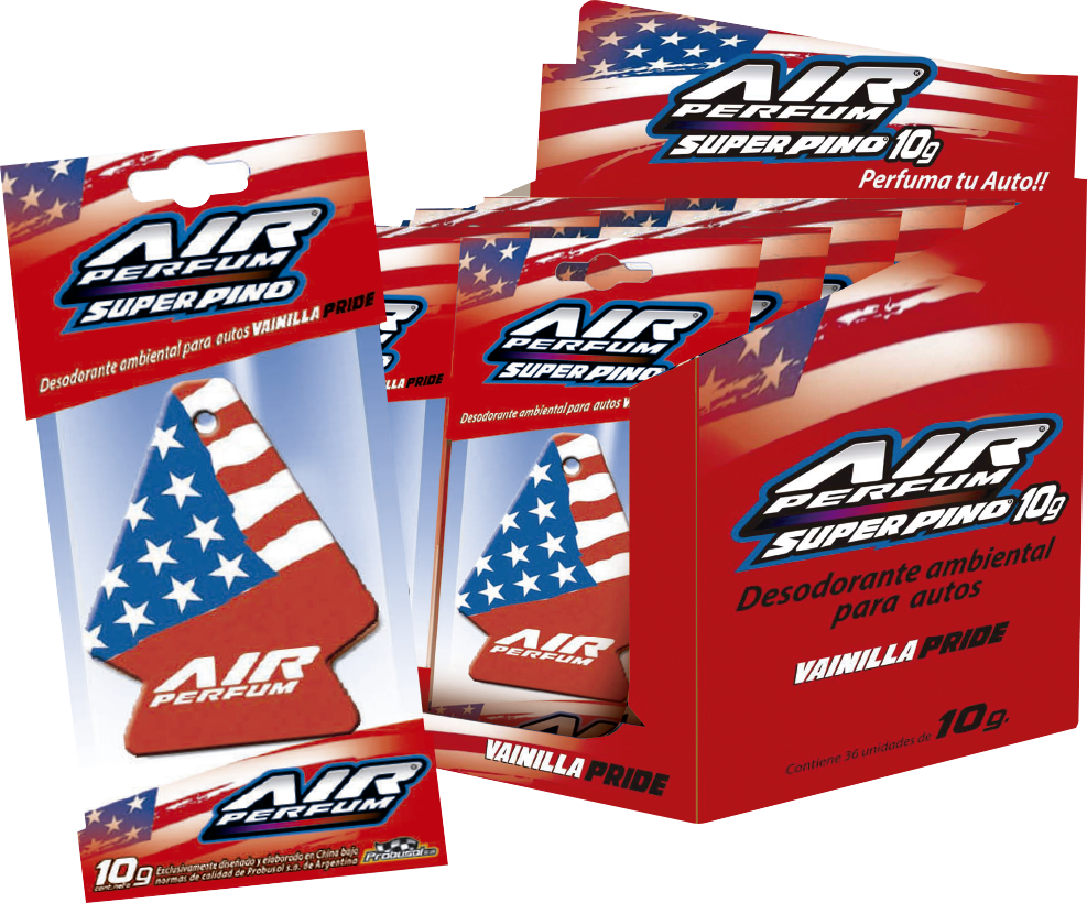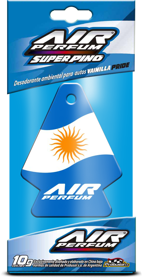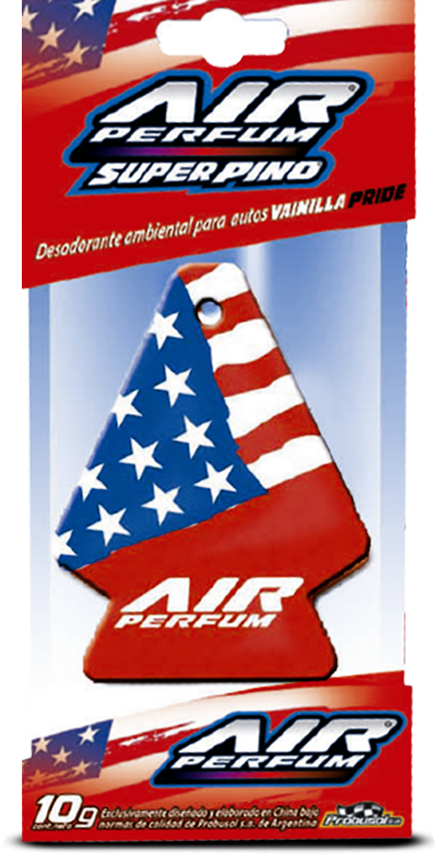 Desodorante ambiental para autos son la perfecta combinación de fragancia y color de las banderas Argentina y U.S.A. De acción continua, estos pinos mantienen intactas sus cualidades de perfume y color por mucho más tiempo